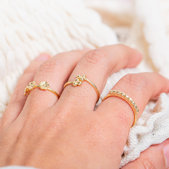 Minimalista e versátil, este anel de bolinhas em prata dourada é ajustável e fácil de combinar com outras peças. Um essencial delicado para o seu porta-jóias.