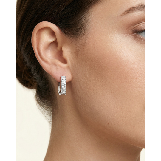 Argolas modernas com perfil geométrico, realçadas por duas fileiras de zircónias em corte baguete. O design estruturado traz um toque contemporâneo à elegância clássica da prata.