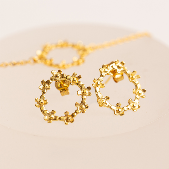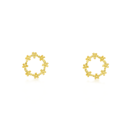 Brincos em prata dourada em forma de coroa de flores. Brincos com fecho de espeque.