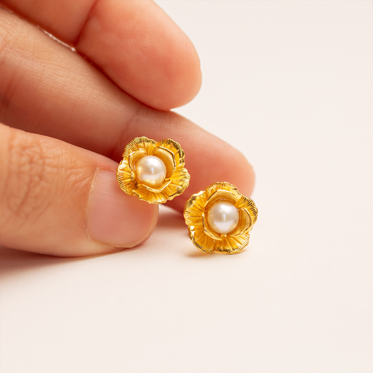 Brincos em prata dourada em forma de flor com pérola de água doce no centro. Brincos com fecho de espeque.