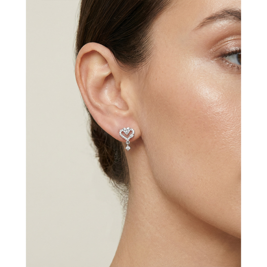 Brincos românticos em prata com acabamento polido, em forma de coração cravejado de zircónias cintilantes. Um detalhe pendente com zircónia dá movimento e charme à peça. Ideais para ocasiões especiais ou para acrescentar brilho aos looks do dia a dia.