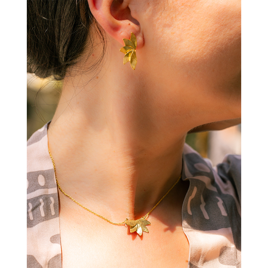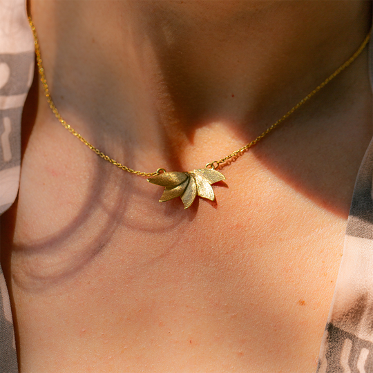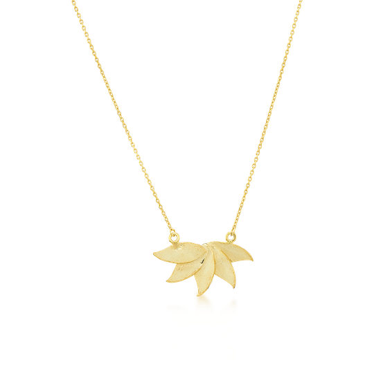 Colar em prata dourada com pendente de cinco folhas e acabamento fosco. Fio ajustável.