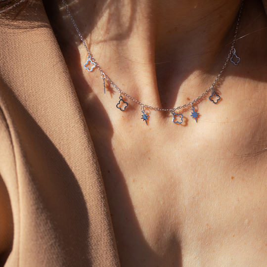 Colar em prata com delicados pendentes de estrelas e trevos ao longo da corrente. Um modelo leve e elegante que acrescenta brilho e movimento ao look.