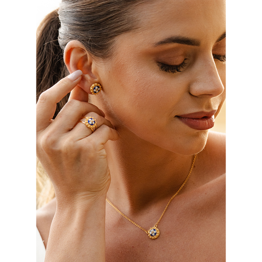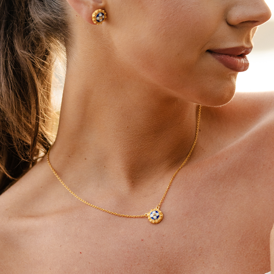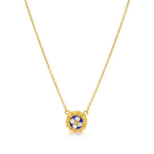 Colar de filigrana em prata dourada com elemento central redondo azul e branco.