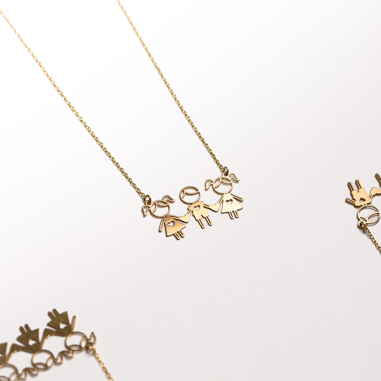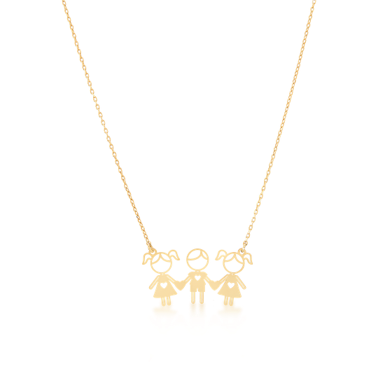 Colar em prata dourada com recortes de duas meninas e um menino. Colar ajustável. Adorável presente para mães, tias ou avós. Original e exclusivo Lugar da Jóia.