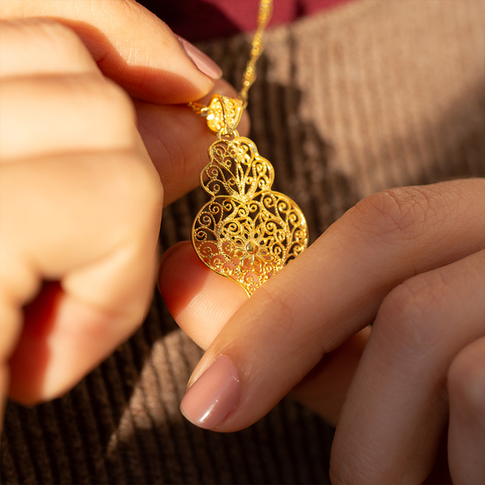 Leve e trabalhada à mão, esta medalha coração em filigrana de prata dourada é um tributo à tradição portuguesa. Uma peça simbólica, cheia de detalhe e alma.