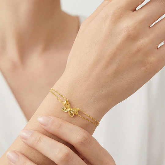 Pulseira com pendente em forma de borboleta de prata dourada. Um design encantador que combina delicadeza com o saber-fazer tradicional da filigrana portuguesa.