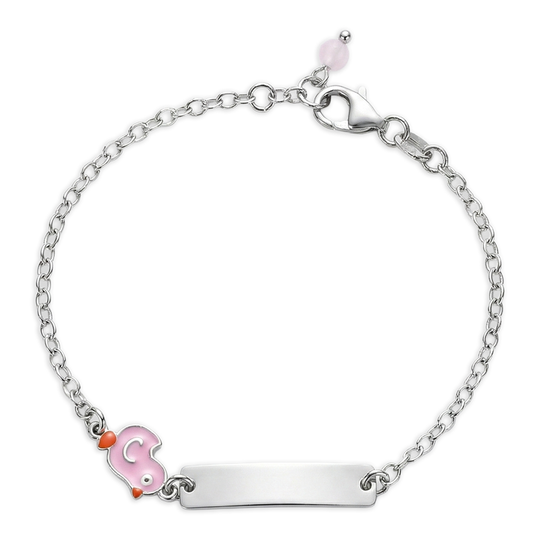 Pulseira em prata com placa lisa ideal para gravação e pendente de pintainho esmaltado em rosa. Uma peça personalizada e cheia de ternura.