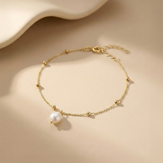 Pulseira de malha com pequenas esferas em prata dourada 925 e uma pérola de água doce. Fio ajustável.