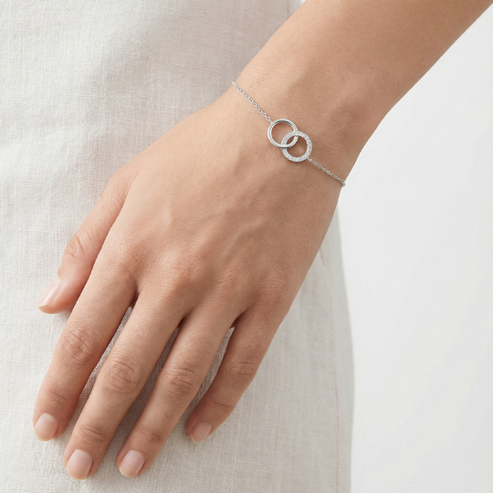 Pulseira em prata com dois elos entrelaçados, sendo um deles totalmente cravado com zircónias. Um símbolo de ligação eterna, com um toque de brilho delicado.