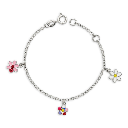 Pulseira em prata com delicados pendentes em forma de flor esmaltada, cheios de cor e alegria. Um modelo encantador para dar um toque especial aos looks das mais pequenas.